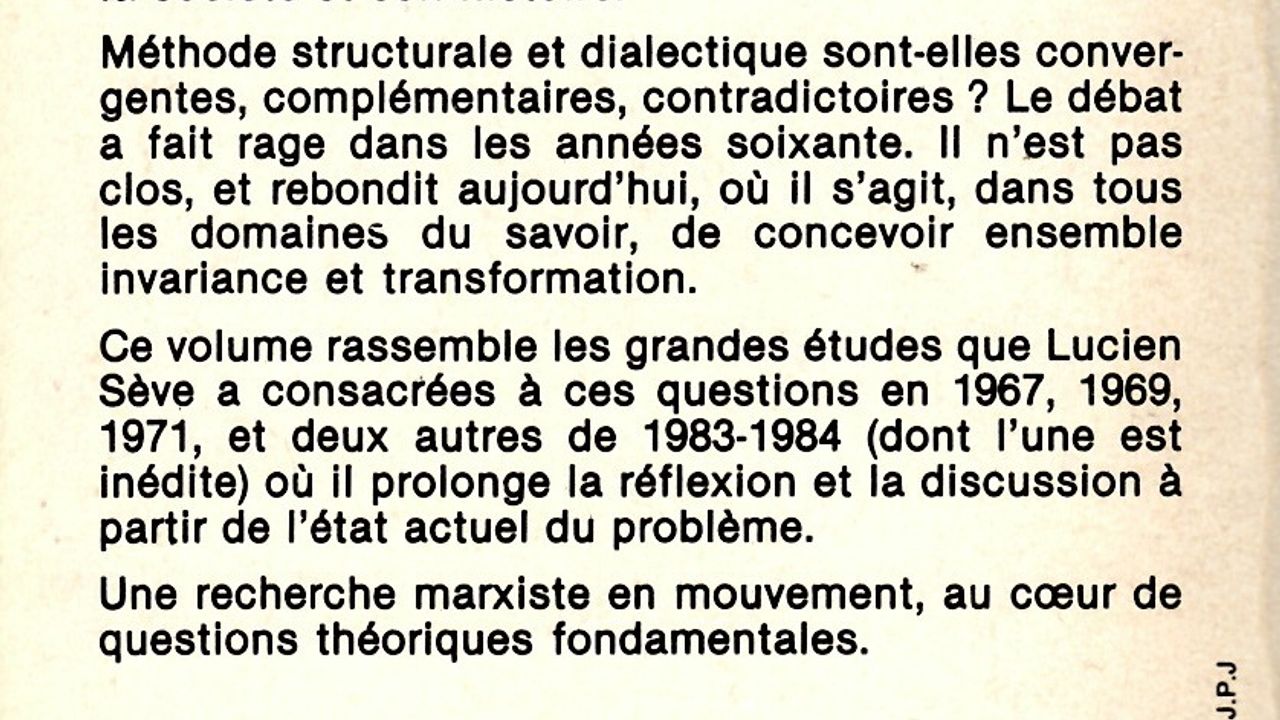 Lucien Sève. Structuralisme et dialectique. Recueil d'articles de 1967, 1969, 1971, 1983 et 1984 ; Éditions sociales (collection Essentiel), 1984, 261 pages