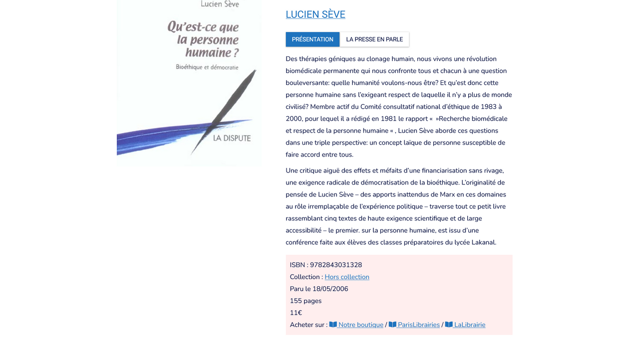 Lucien Sève. Qu'est-ce que la personne humaine ? Bioéthique et démocratie ; La Dispute, 2006, 155 pages