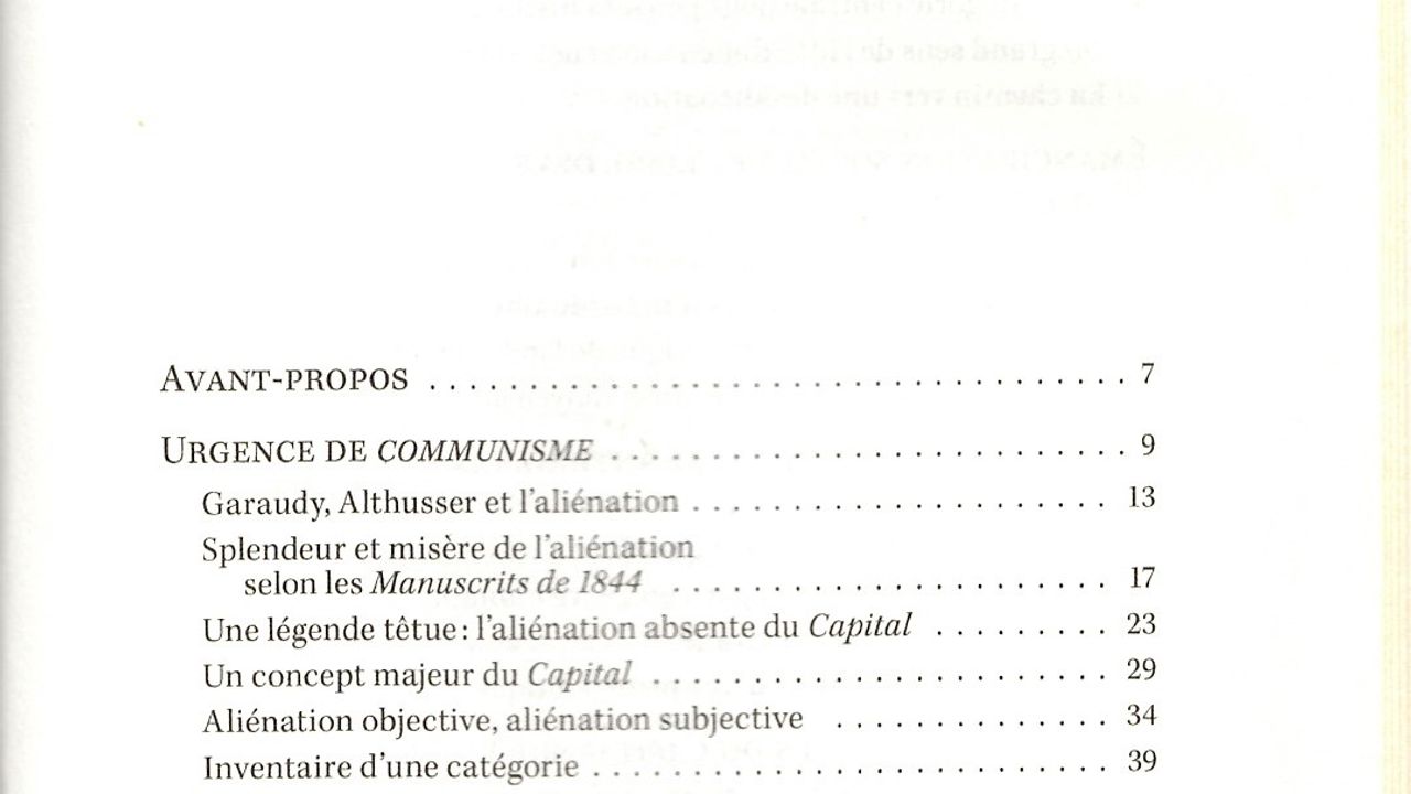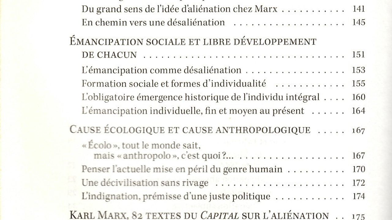 Cet ouvrage propose une lecture inédite de Marx en montrant, nombreux textes à l'appui, que l'idée d'aliénation, centrale dans les Manuscrits de 1844, texte de jeunesse auquel s'arrêtent la plupart des commentateurs contemporains, non seulement ne disparaît pas du Capital mais y acquiert une tout autre portée. Au-delà de la dénonciation des souffrances de l'individu au travail, elle met en examen les logiques de base du capitalisme : faute d'appropriation collective, les productions humaines de tous ordres se convertissent en puissances sociales incontrôlables et écrasantes, menant le genre humain à sa perte.