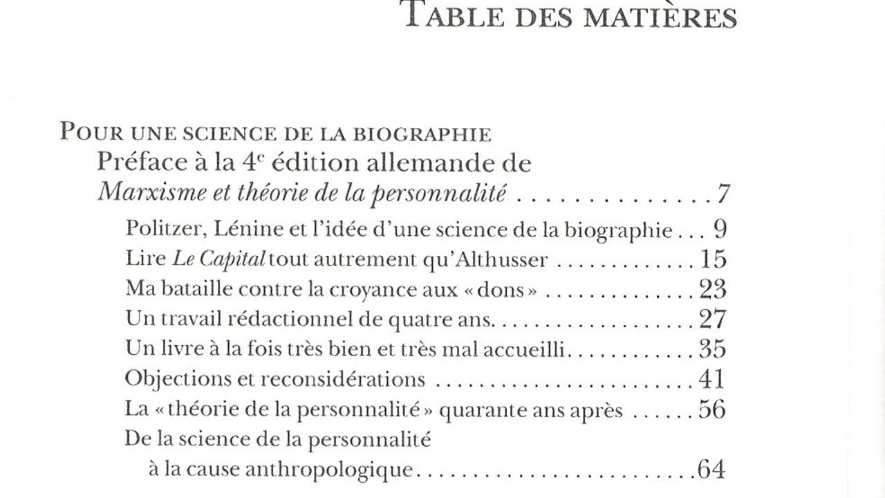 Les deux textes de Lucien Sève publiés ici forment une présentation largement accessible de cette possible science de la biographie dont il fait partager l'intérêt au lecteur. Le premier, version française de la préface à la 4e édition allemande de Marxisme et théorie de la personnalité, suit la chronologie des idées qui, en construisant cette théorie de la personnalité, ont construit la personnalité de son auteur. Il y détaille les débats qui l'ont opposé aux pavloviens, aux expérimentalistes, aux partisans des « dons », à Louis Althusser. On y croise Stendhal, Politzer, Vygotski, Freud, Oddone, Schwartz, Clot, Jay Gould... pour chaque fois, expliquer une notion, faire naître un concept, éclaircir une question fondamentale.